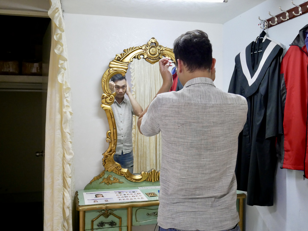 輪到我弟 , 不只女生愛美 , 男生也不惶多讓 , 整理頭髮很專注