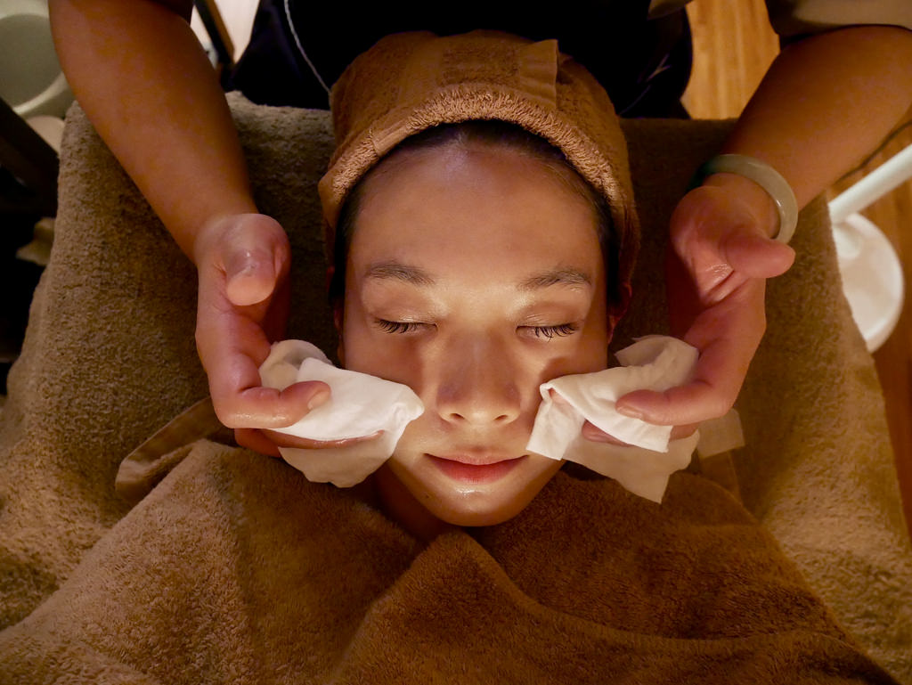 今天做的是全效臉部敏感修護課程 , 用了保濕卸妝+綠茶素清潔乳 , 氣味都很舒服