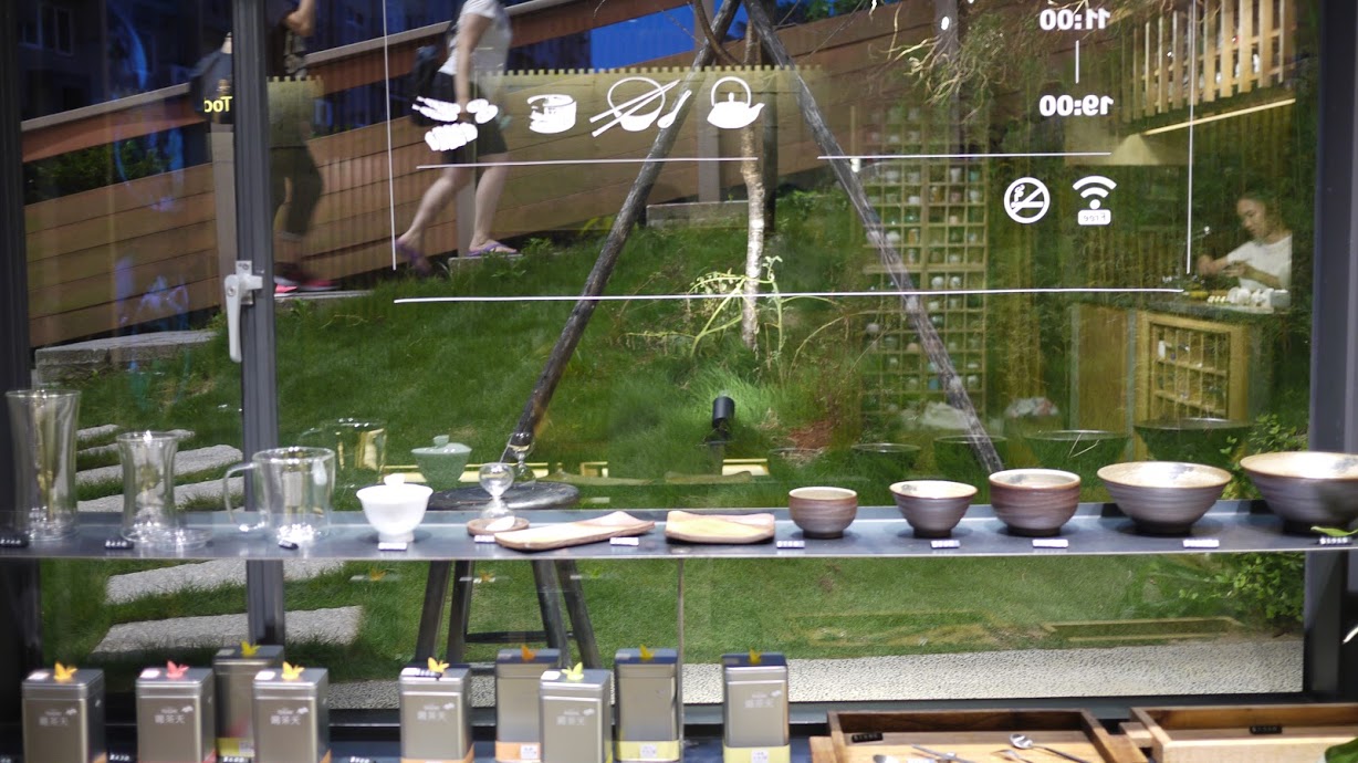 天色晚了,今天好幸運又見鶯歌藍 玻璃上反射著店內人員忙碌的身影