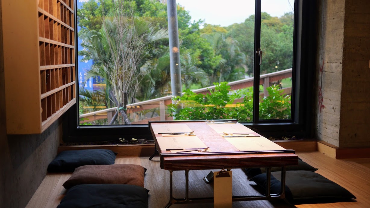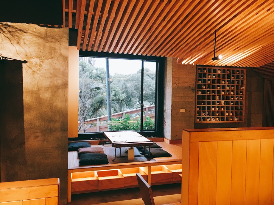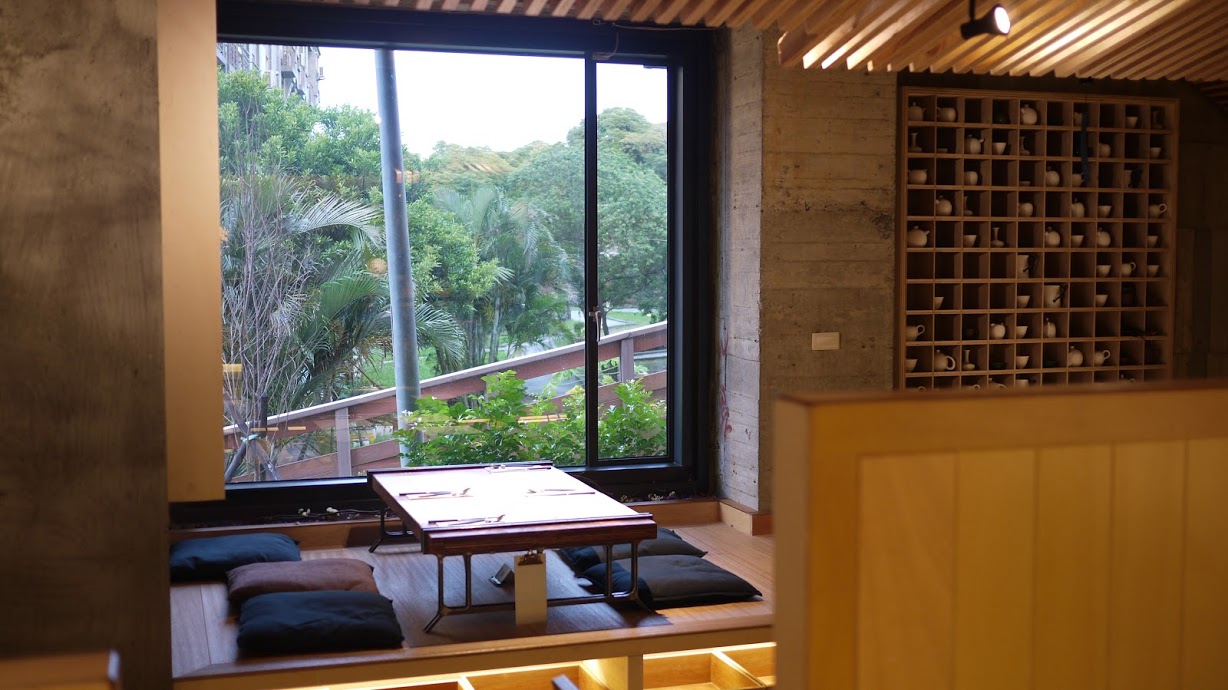 一入座,便被這處茶座的風景給炫目,好寧靜的一方地點啊! 我家老二一直吵著要去這邊臨窗賞景 可孩子手粗腳粗的,很怕去碰瓷到那架上一格又一格美麗的茶具 所以我只能狠心說“不”