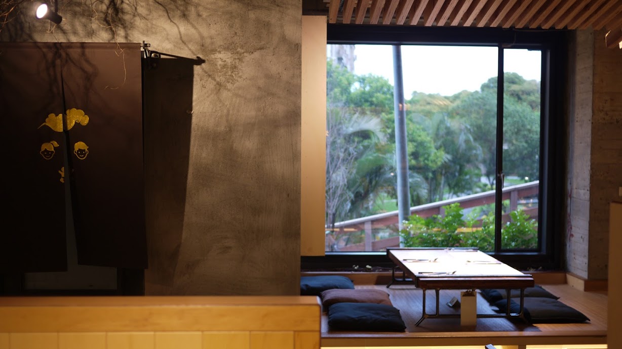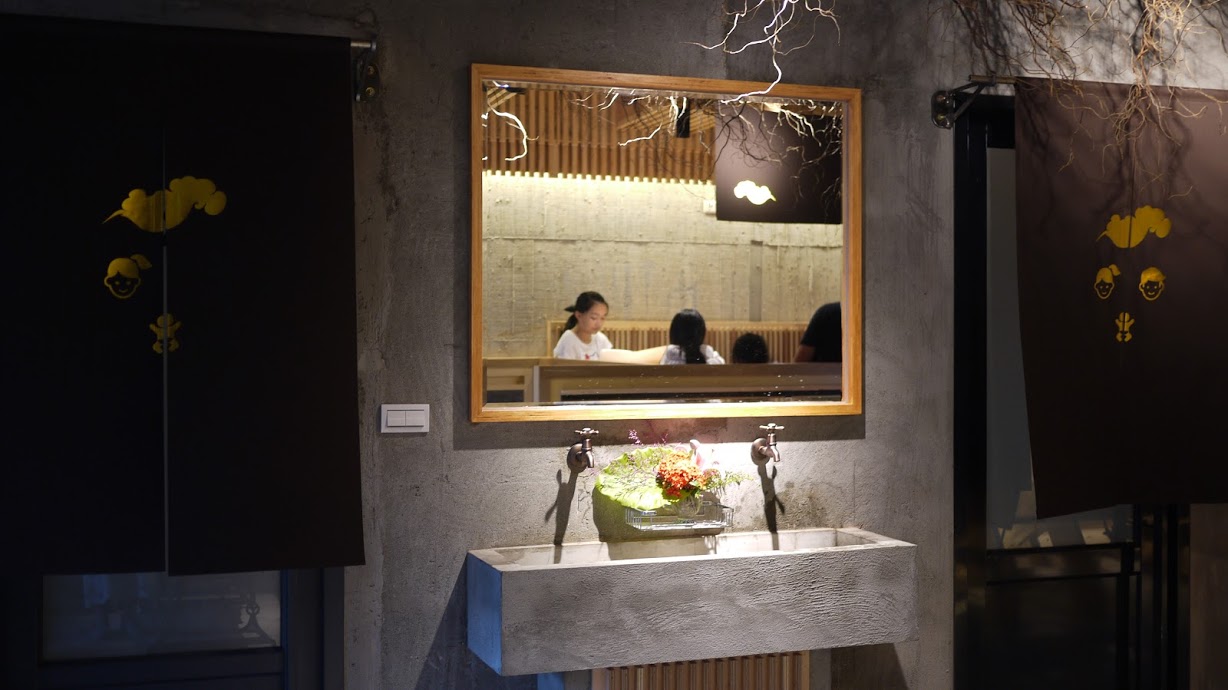 廁所外頭佈置著洗手台,上頭的鏡子可以反射較高的座位,這次我們三大兩小便被安排在此入座