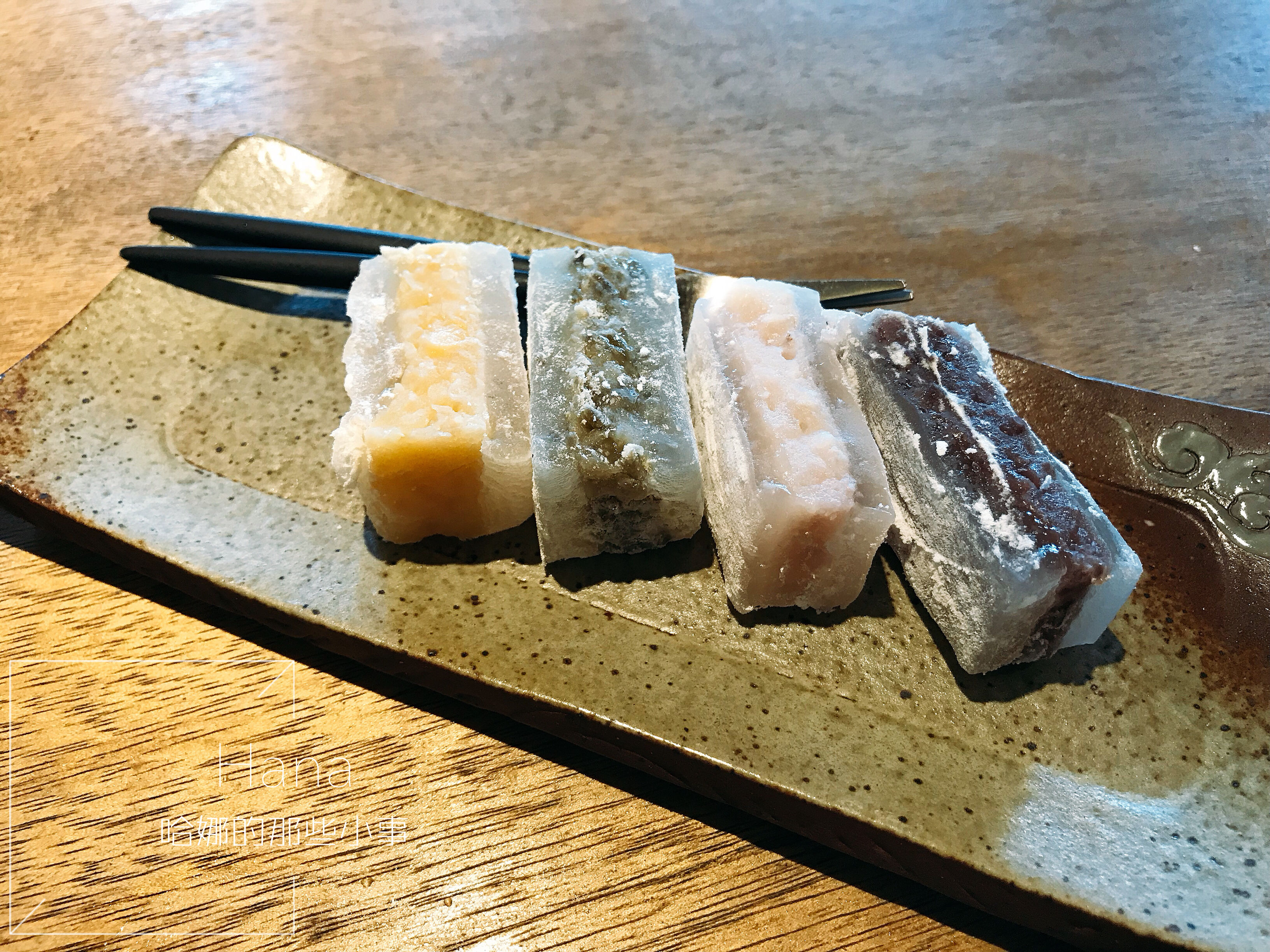 綜合水晶糕的口味由左至右分別是連子、綠豆、芋頭、紅豆。