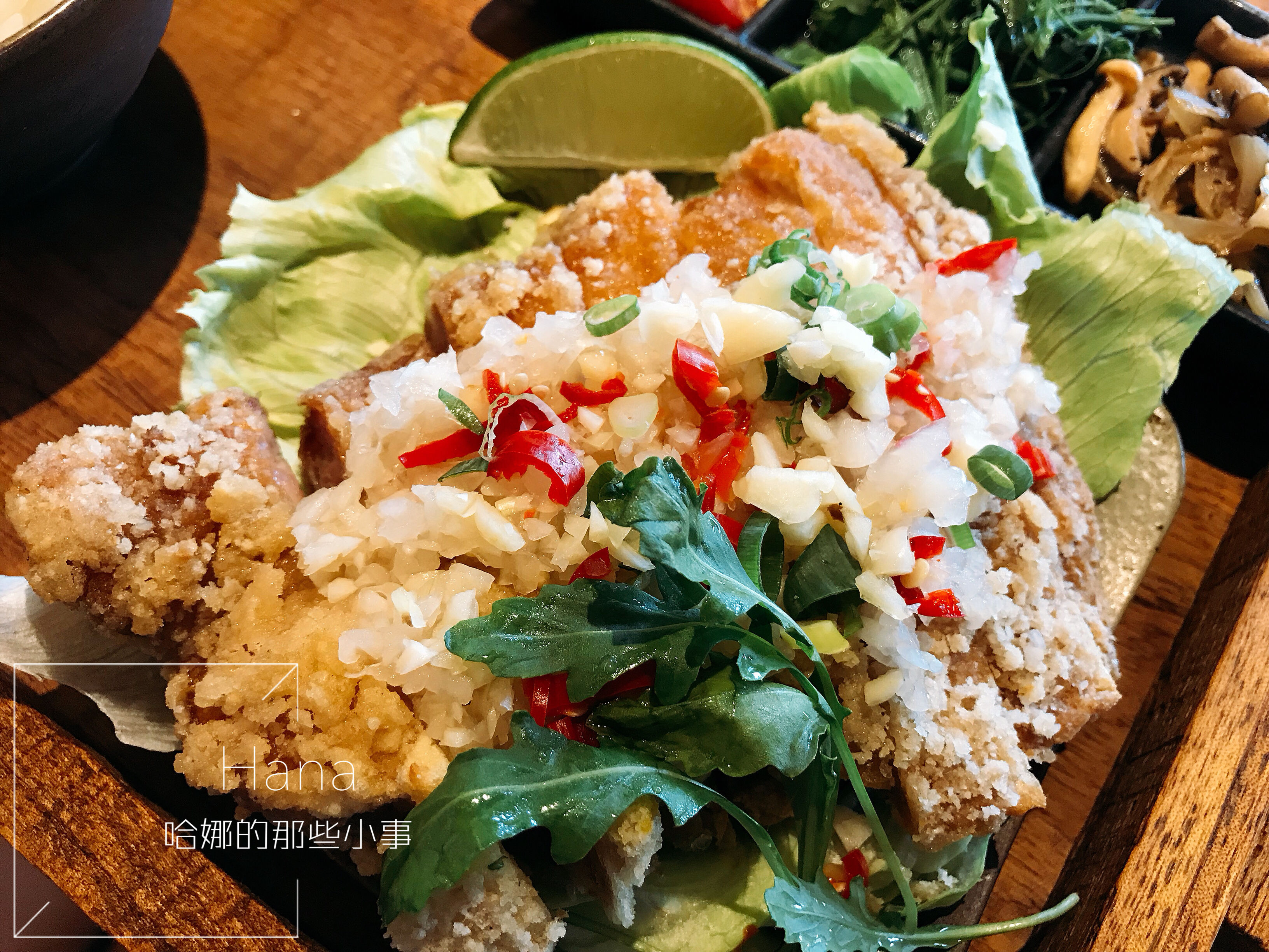 這道料理是使用醃漬酥炸過的去骨雞腿淋上洋蔥、檸檬、辣椒、蔥蒜等醬汁而成。