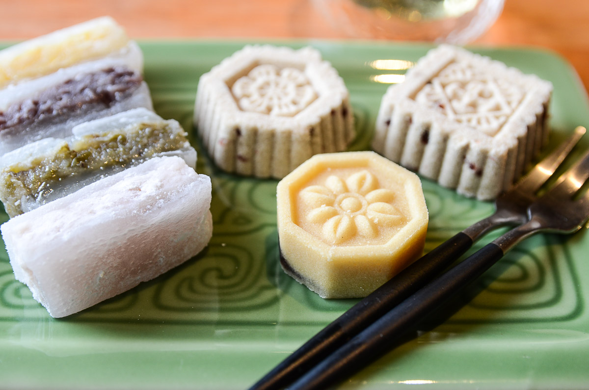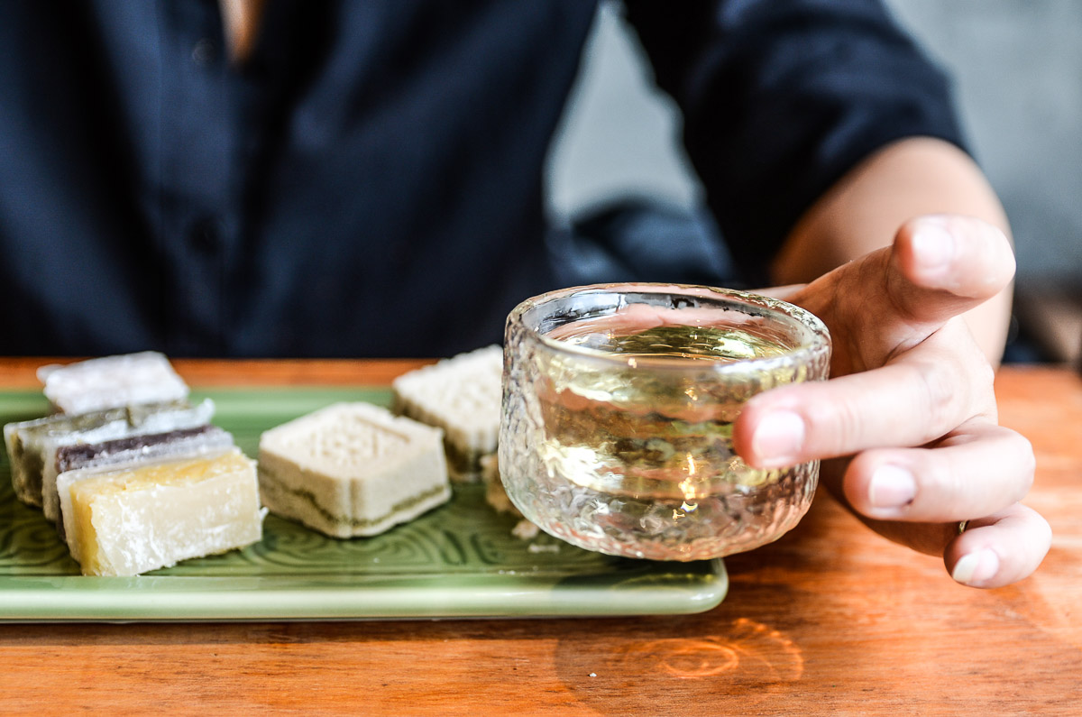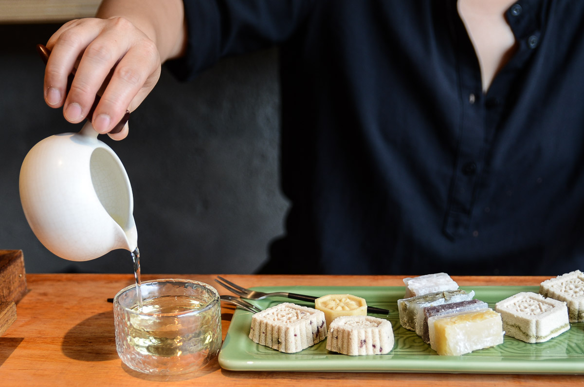 由左而右為抹茶糕仔*3、綜合口味水晶糕*4和單點茶所附的糕點*3,是不是頗有古代達官貴人用御膳(點心)的感覺呢?以前只有皇帝和達官貴人能享用的點心美食,現在竟然可以一次吃到這麼多種,身為現代人實在太幸福了!喝茶天在糕點上桌前會先炊過(翻成國語就是蒸) 經過這道手續讓糕點回春到剛做好的Q彈狀態。