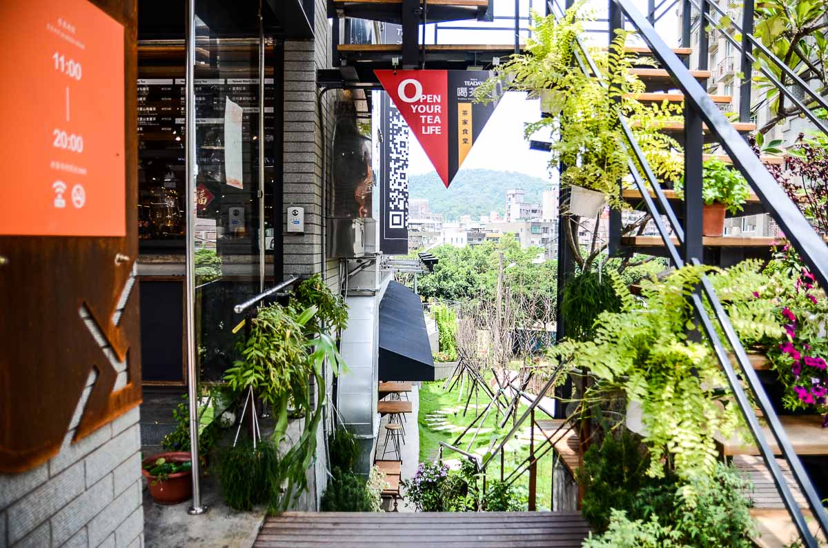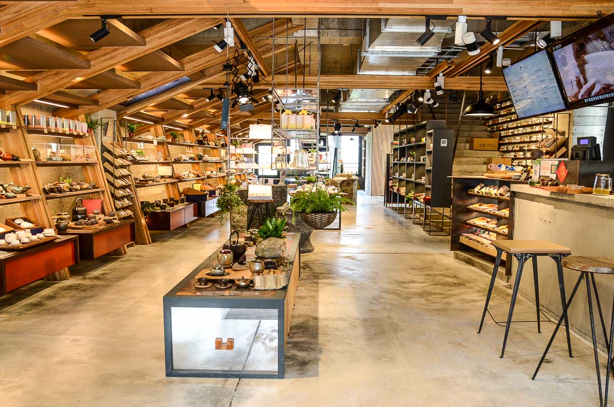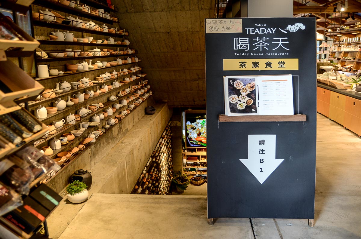 一樓是宜龍茶器的店面,旁邊的走道大大的箭頭指示著通往茶家食堂的階梯,隱約可見庭園造景和戶外桌椅。