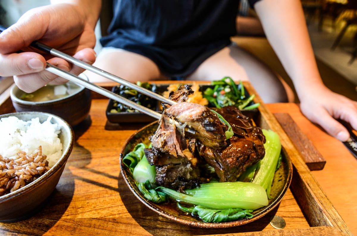 滷肉上放了一片青一片褐的茶葉,看到擺盤我嚇了一跳,感覺好像來到精緻中菜館,常見的滷肉以醬油、八角滷製,這道茶料理多加了紅茶葉和豬肉一起燉煮,吃起來不會過鹹和油膩,肥肉入口即化,瘦肉入味不乾柴,從裡到外都有入味,肥瘦一起吃味道融合得宜,拿來配飯大人小孩都喜歡!