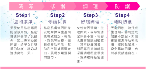 先帶大家看看日常私密保養步驟:分為清潔 -> 修護 -> 調理 -> 防護