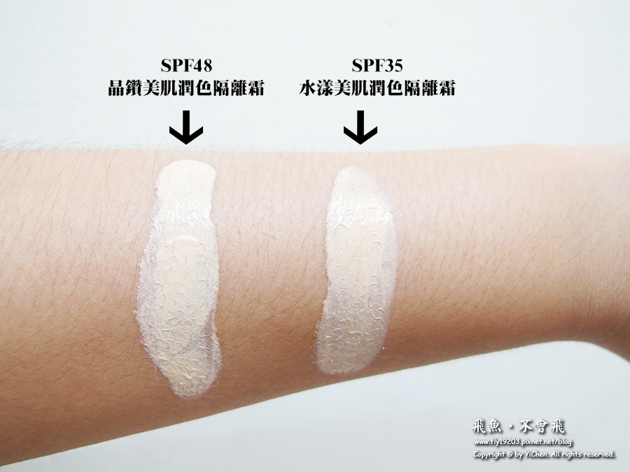 分別為「SPF35水漾美肌潤色隔離霜」、「SPF48晶鑽美肌潤色隔離霜」