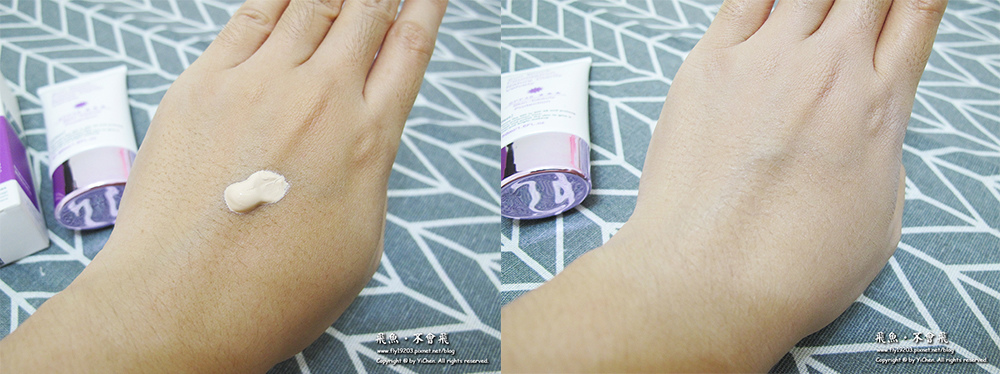 使用上感覺比我原本膚色再白了一個色階的感覺,我習慣直接用手推勻,質地濕潤好推