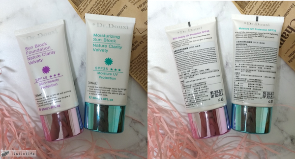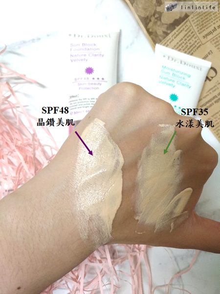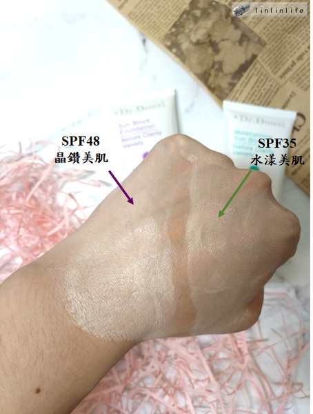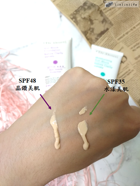 首先,先來比對一下SPF35水漾美肌潤色隔離霜(小綠)與SPF48晶鑽美肌潤色隔離霜(小紫)的差異