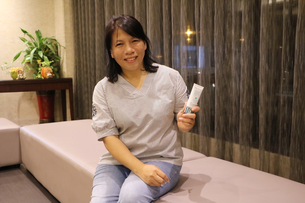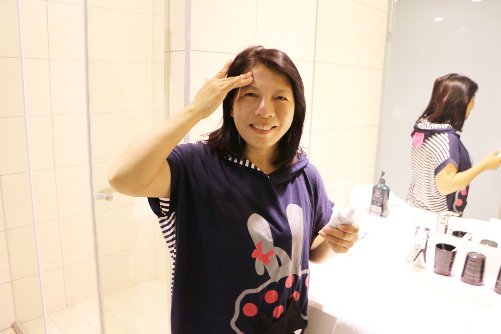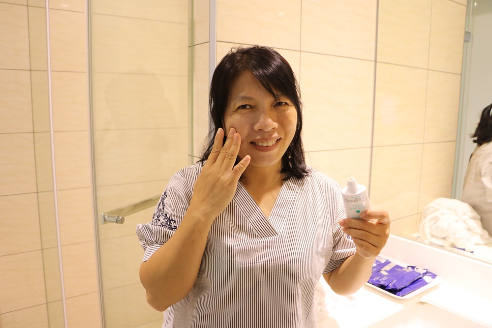 外出跑踩點,攜帶不僅方便,而且簡單的淡妝就可出門。 Hank媽只抹上水漾隔離霜、少許蜜粉、眉筆與淡淡的口紅,膚色感覺精神多了。