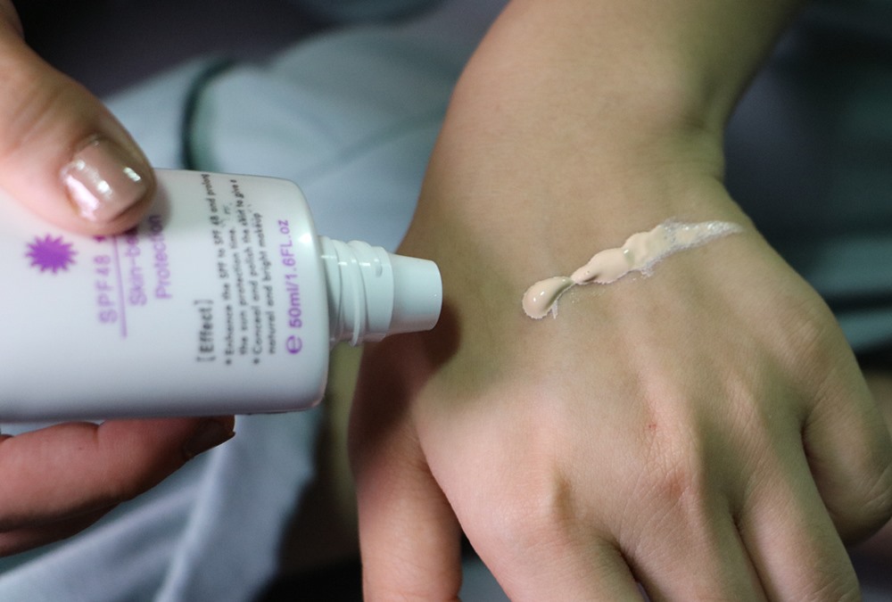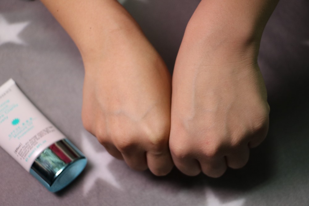 只有右手有塗上水漾隔離霜,是不是呈現自然裸妝色澤。