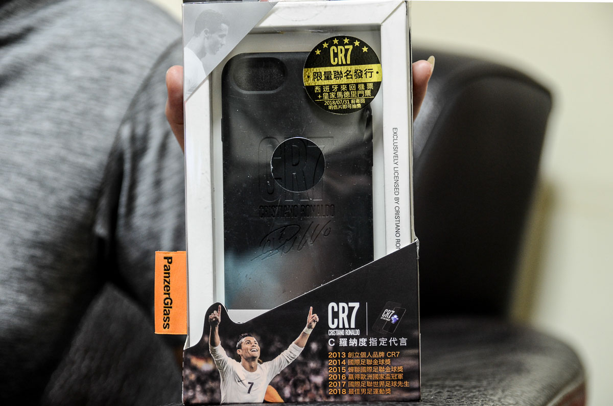 限量版黑色PanzerGlass CR7保護殼,CR7就是Cristiano Ronaldo 取姓名的第一個字母和他的球衣號碼,常簡稱為「C羅納度」或「C羅」,手機殼上除了有C羅的英文縮寫還有簽名,低調幫C羅加油!