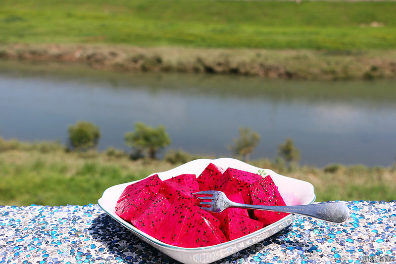 拿去後院的邊看著小溪,邊吃火龍果