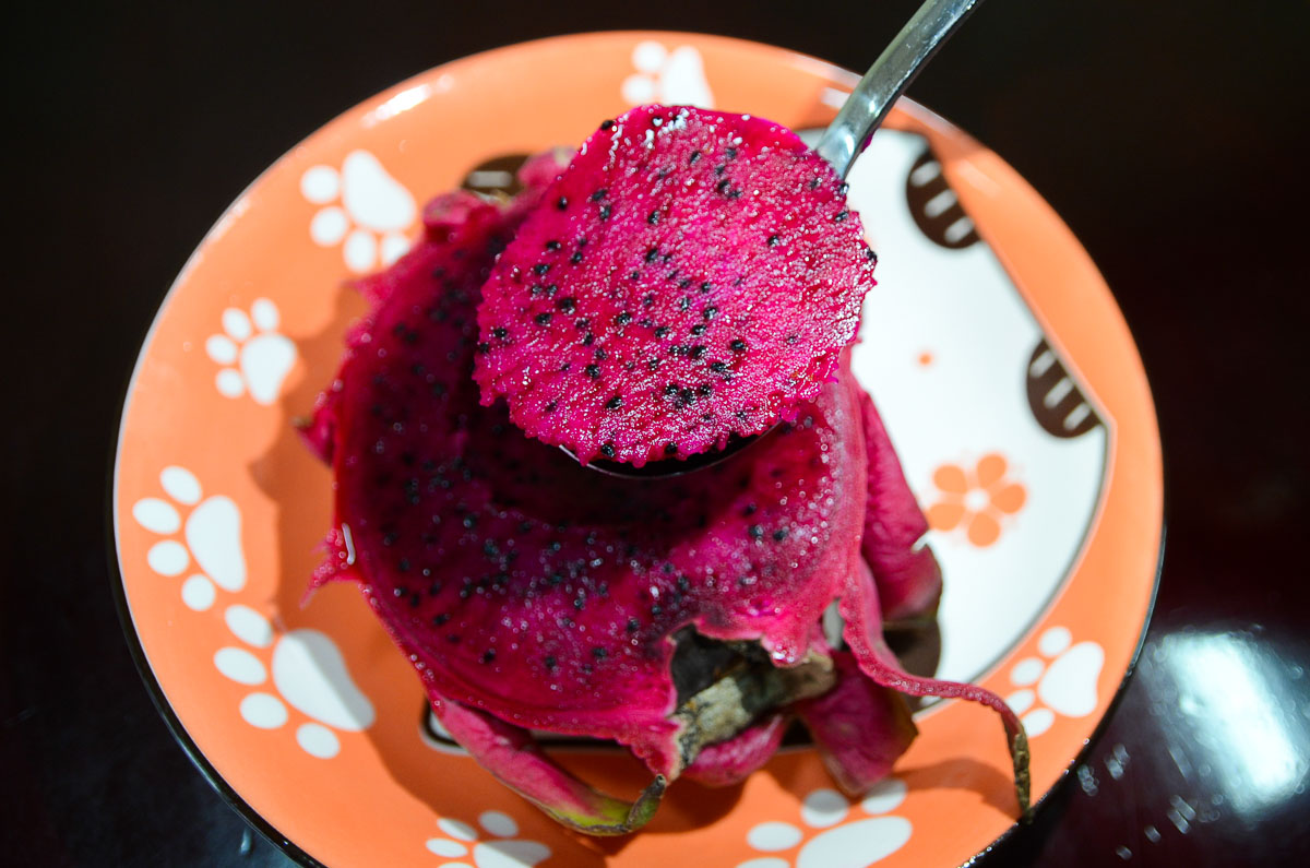 切半用湯匙吃最簡單,紅龍果甜度比一般白肉火龍果要高,台灣西瓜平均甜度大多只有10∼15度,台南仁波霸火龍果甜度卻高達18∼22度,連我不喜歡吃火龍果的螞蟻朋友都被波霸紅龍果成功收服了...