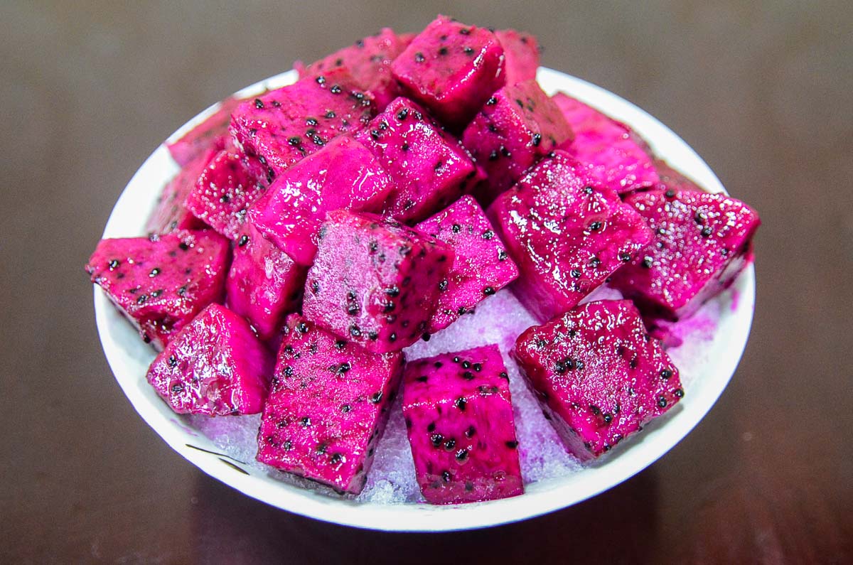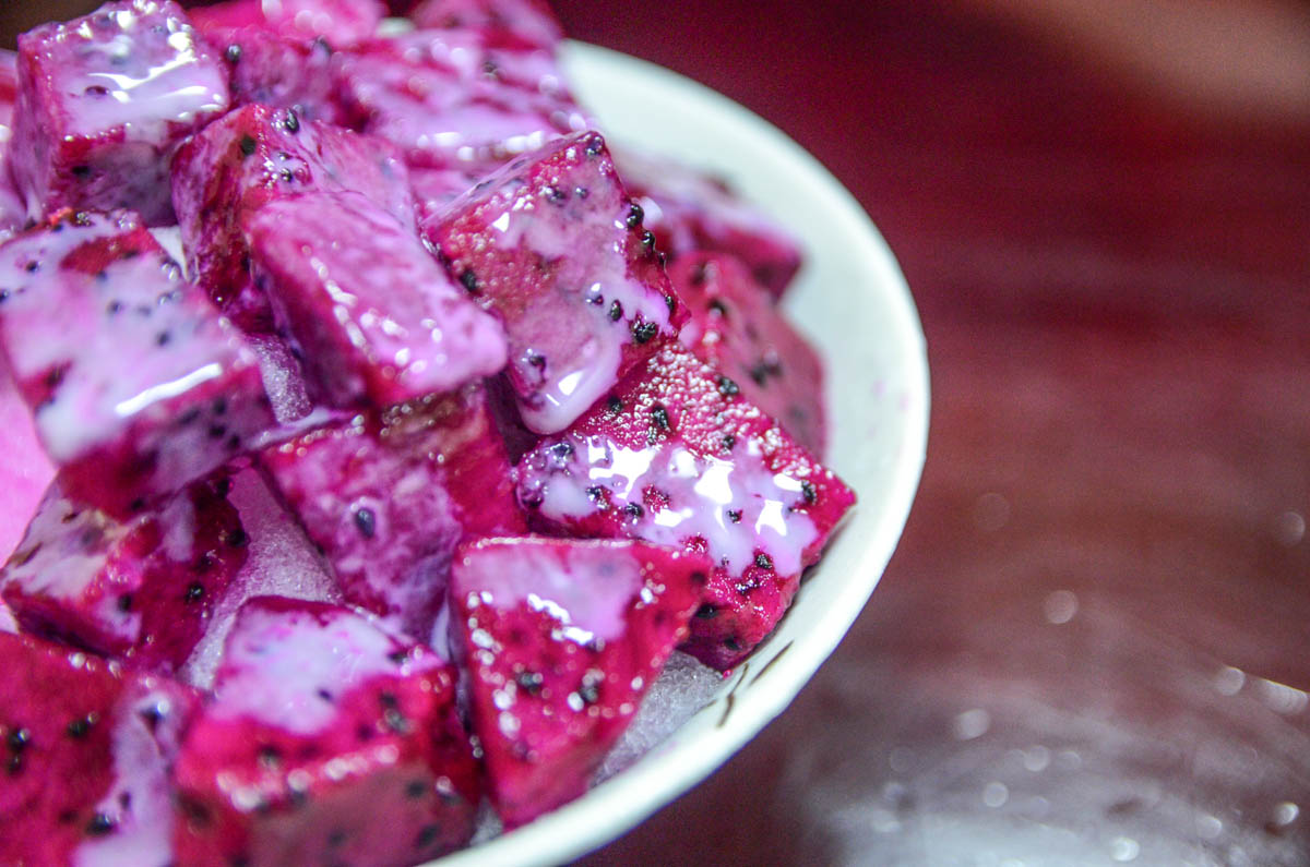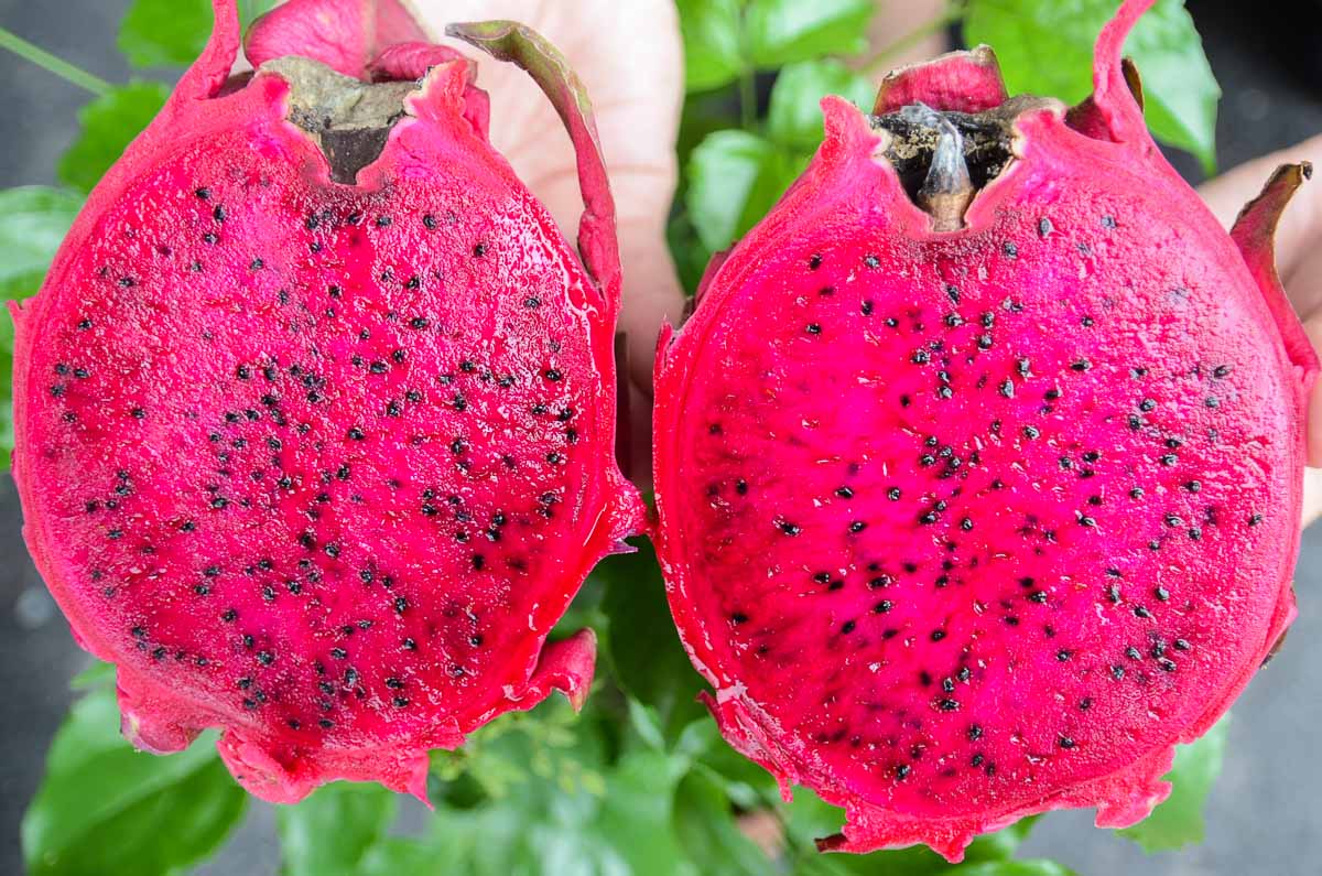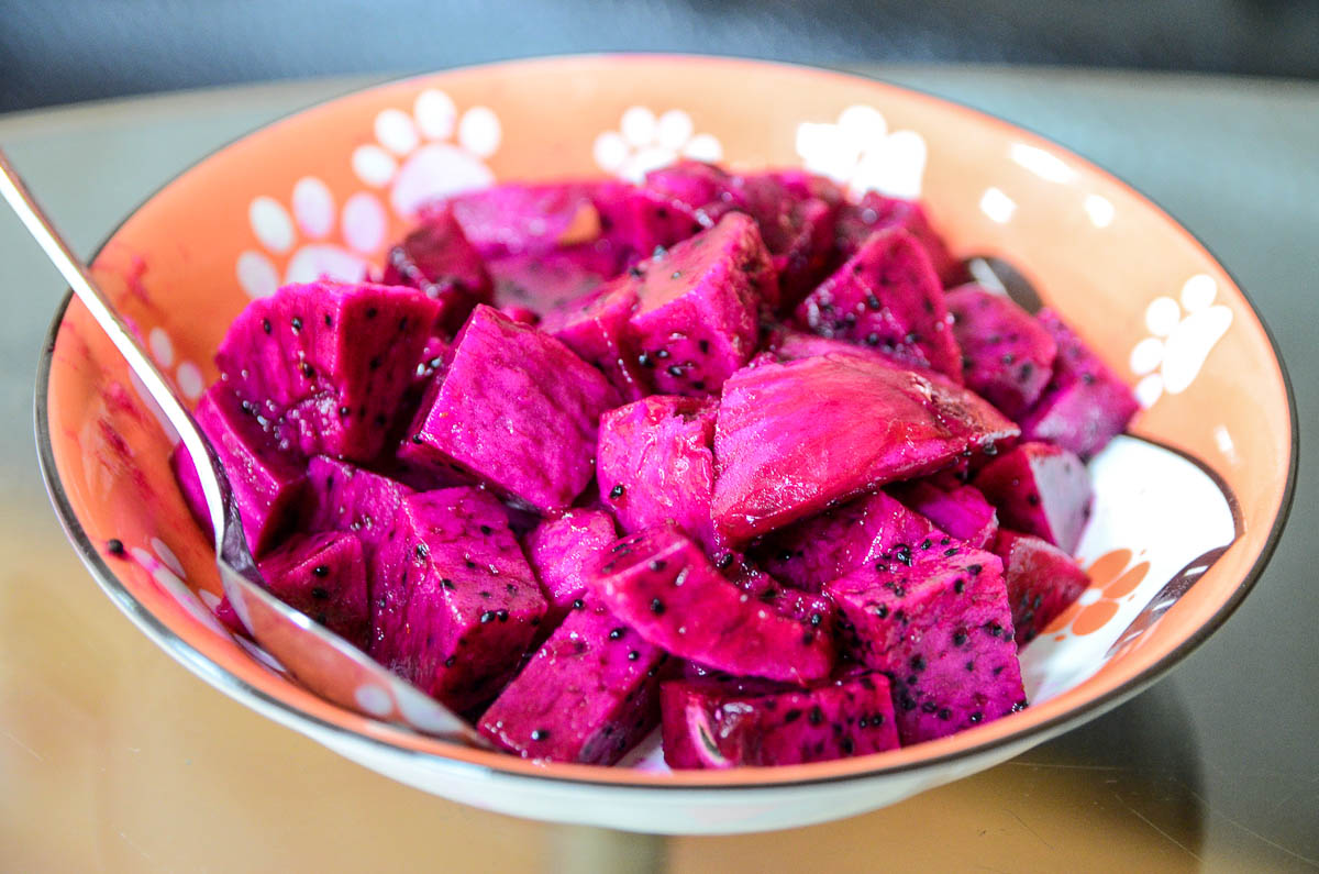 皮薄的波霸紅龍果切開後超級多汁,看起來就是好吃,除了果肉可以吃,台南仁火龍果是無農藥栽種,所以連皮都可以入菜喔!把皮洗乾淨、剁碎後拌蛋液下鍋油煎就成為一道簡單又美味的創意料理。