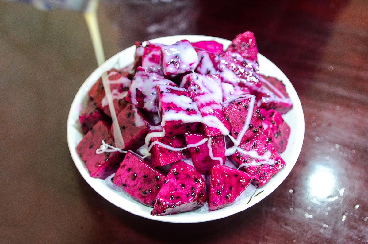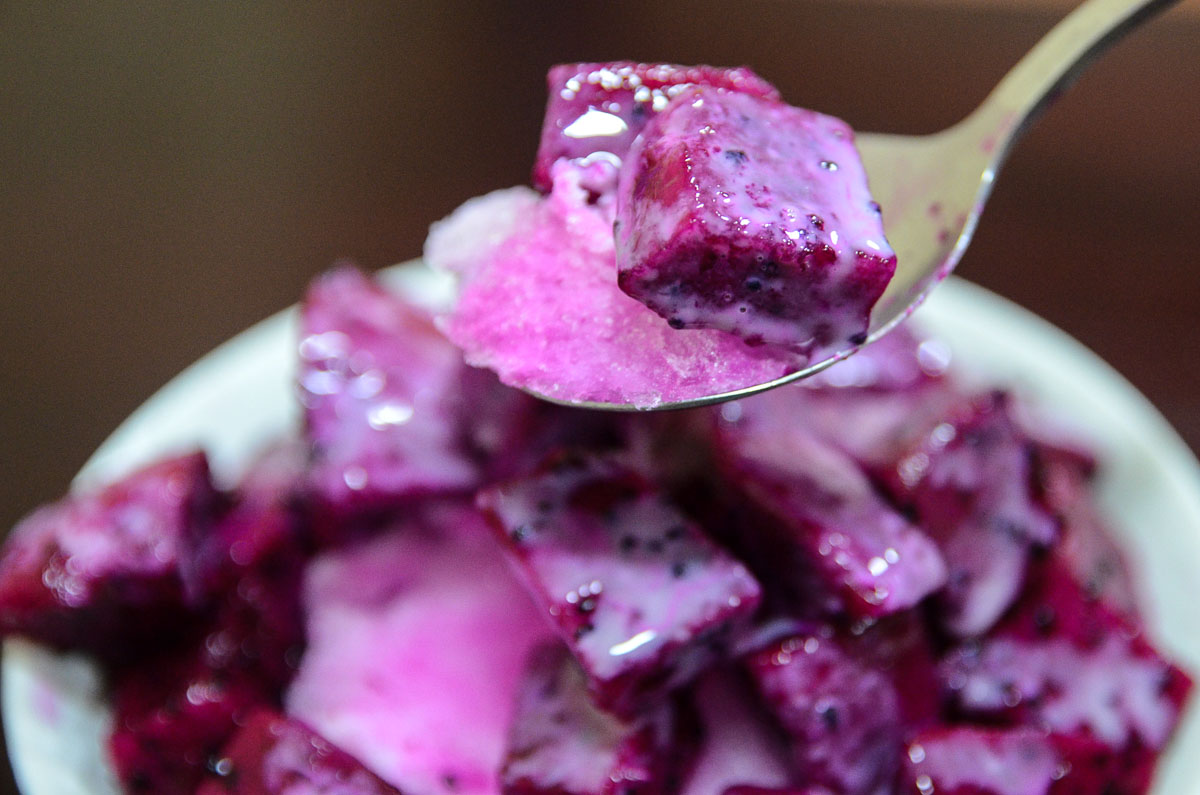 因為紅龍果已經夠甜,所以我們只用剉冰、火龍果和煉乳這幾種簡單的材料做一盤水果冰,如果喜歡甜一點的人可以再加糖漿。