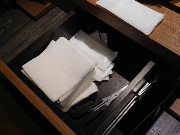 抽屜一打開就是 餐巾紙 濕紙巾 與 食物用剪刀