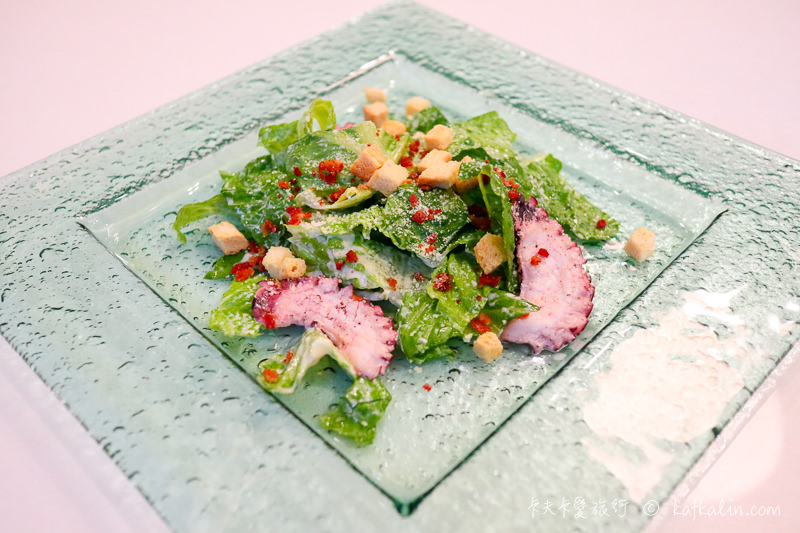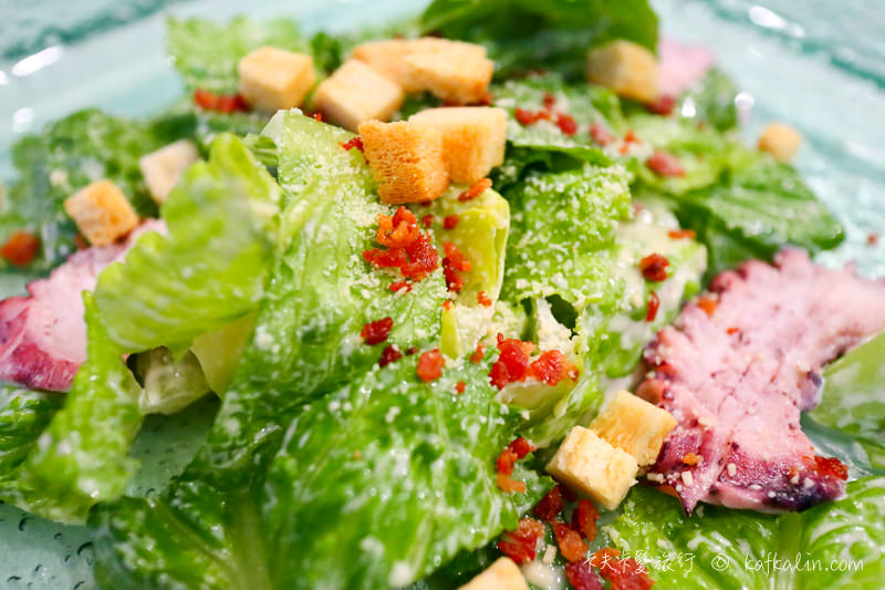 羅曼生菜加上凱薩醬、吐司末脆餅、起司粉、培根脆末,略有嚼勁,卻越嚼越香的大章魚