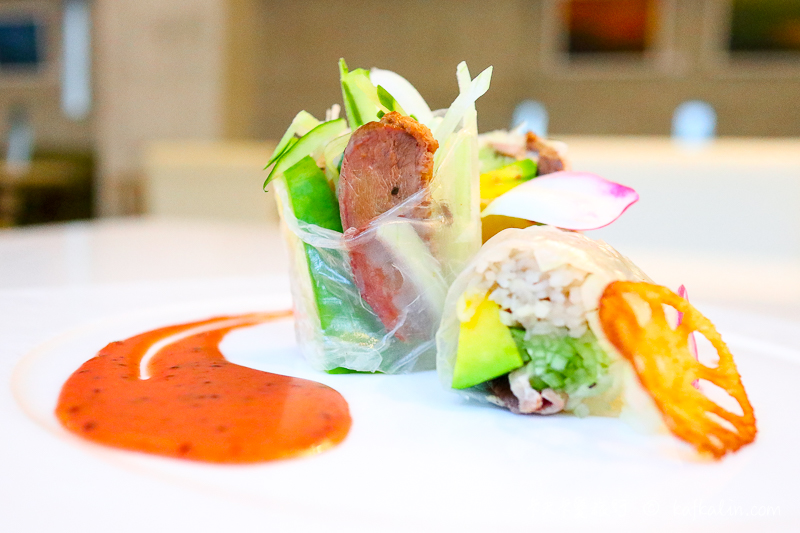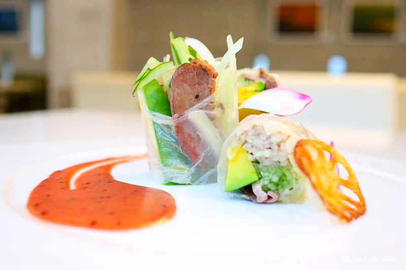 櫻桃鴨胸先用香料醃製後低溫烹調,微燻的鴨胸肉搭配蘿蔔絲及蔬菜絲一起包入生春捲中,沾點紅麴醬微酸滋味