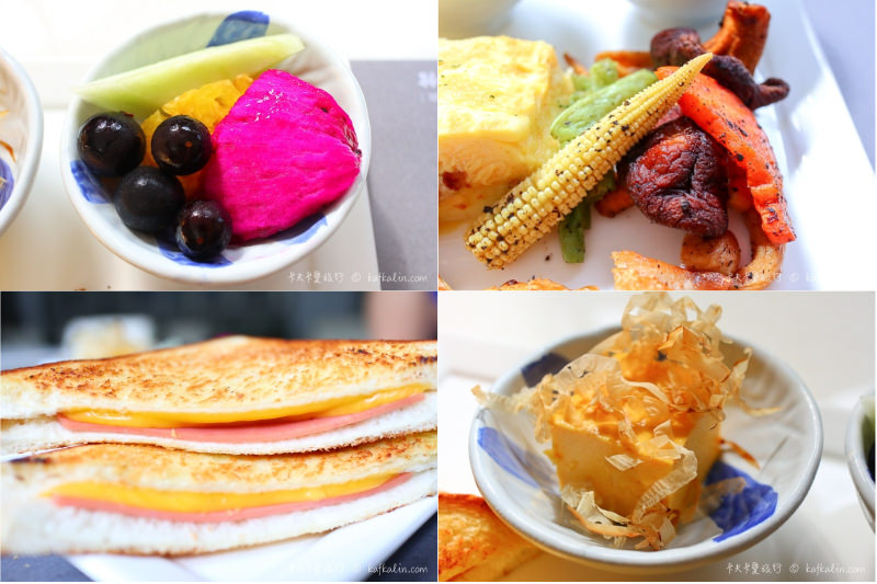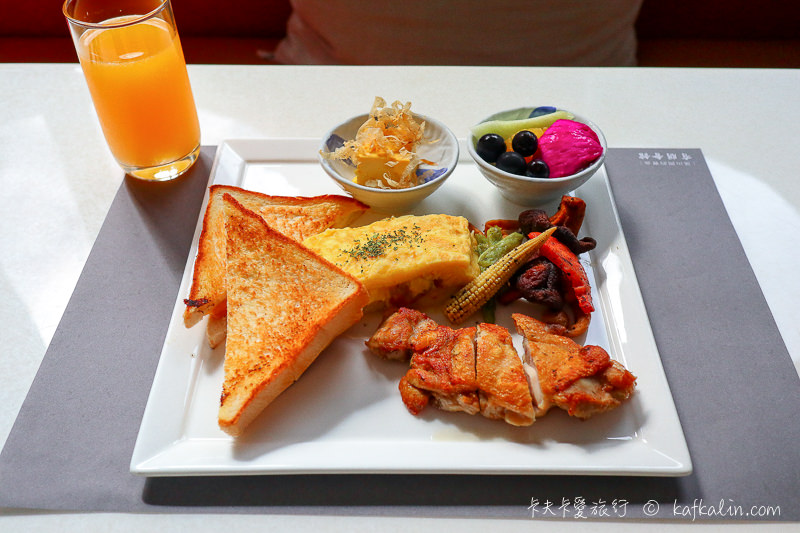 豐盛的早餐,每個人一份西式的早餐系列,包含了雞胸肉、歐姆蛋、手工豆腐、香煎時蔬、烤火腿起司吐司、水果及飲料等