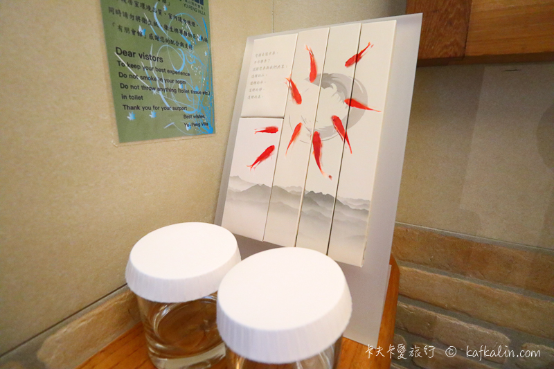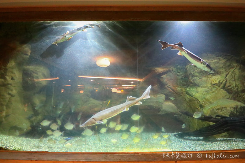 是鱘龍魚在裡面優游,很難得在飯店民宿中看到這麼大的魚缸