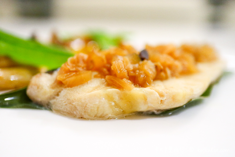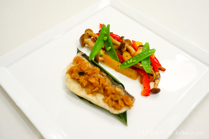 鱘龍魚排先醃製後,月桃葉當底融合月桃香氣在魚肉中,蔭瓜放上頭一起大火蒸熟,再搭配奶油蕈菇