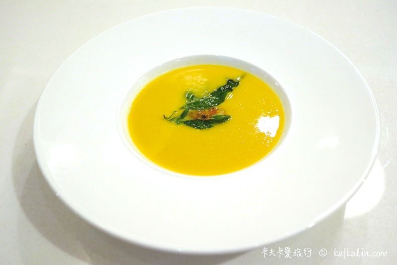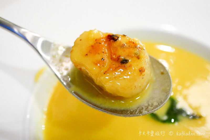 新鮮的玉米下去打成湯,有玉米的鮮甜,並與魚湯長時間蒸煮後打成濃厚湯底,並加入蟹肉及干貝