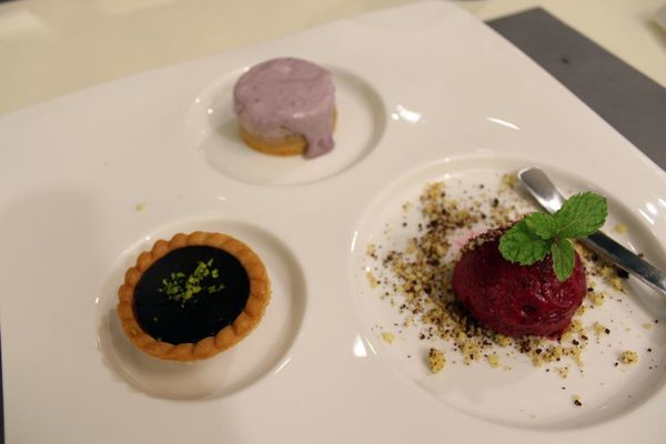 三樣小甜點分別是芋泥餅、巧克力塔及火龍果冰淇淋。