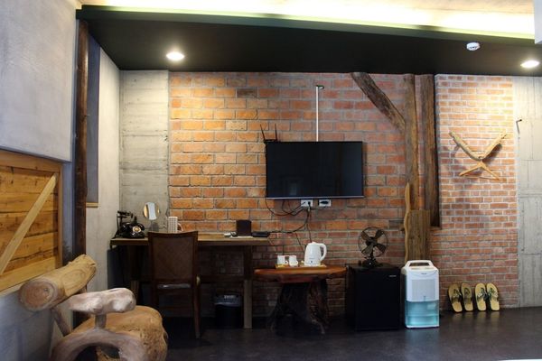 異材質拼接磚牆搭配木製家具,古樸溫暖。