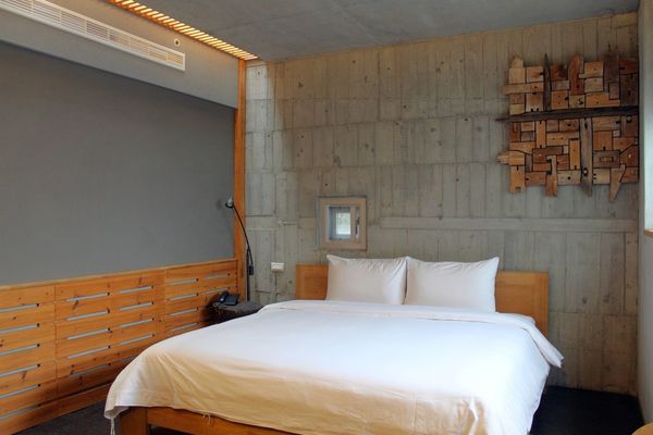 躺在水泥灰牆間的潔白大床,簡潔明快。
