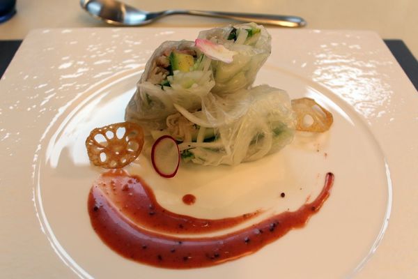 開胃菜-鴨胸蘿蔔米生春捲佐紅麴蜂蜜芥末籽醬汁