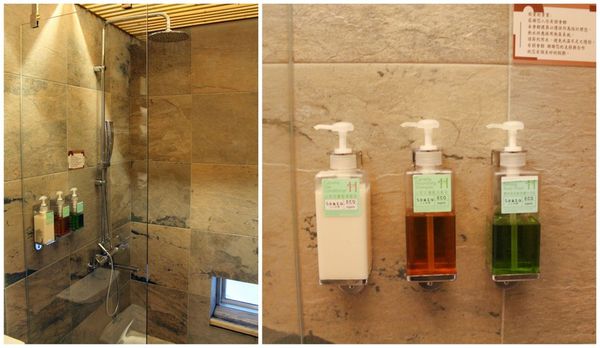 上山採藥的洗髮精、沐浴乳及潤髮乳固定在淋浴間牆上。