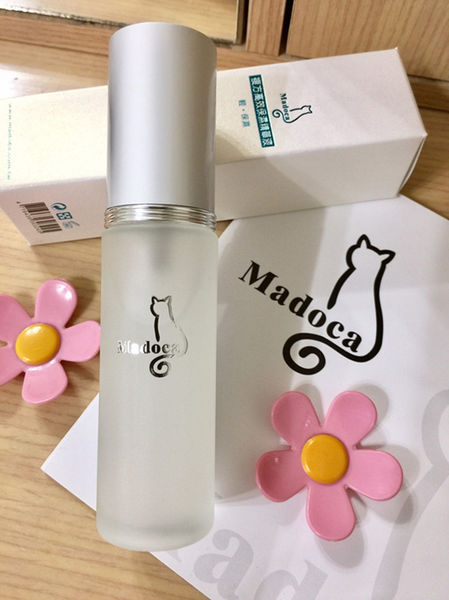 『Madoca瑪朵卡 複方高效保濕精華液』裝在霧面略為厚實的玻璃瓶內,加上貓咪,整個走簡約優雅路線~但是,略為透明的瓶身無法完全阻擋陽光與光線的照射,為免保養品變質我個人都是使用完畢就放回盒內收藏。