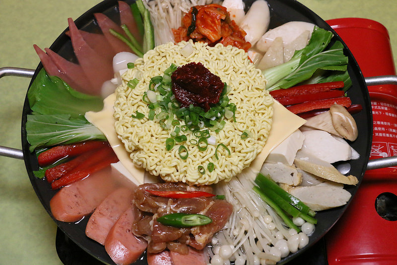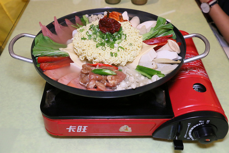 以瓦斯爐加熱,整鍋滿滿澎湃的部隊鍋