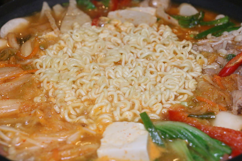 起司、青菜、火腿、金針菇、泡菜、年糕、甜椒
