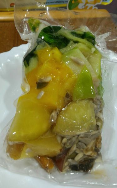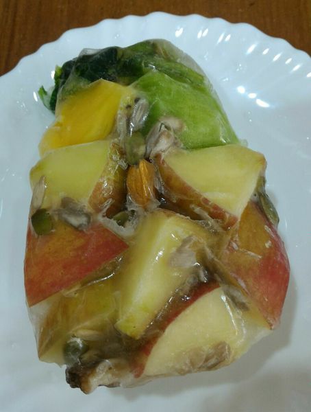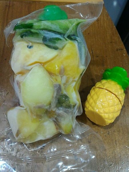 隔著透明的鮮凍包, 可以看到不同的堅果, 好大塊的芭樂、鳳梨和蘋果