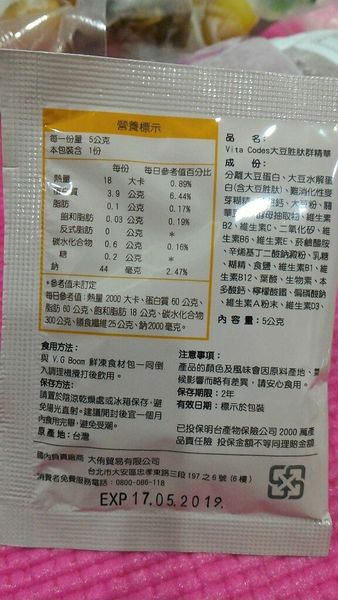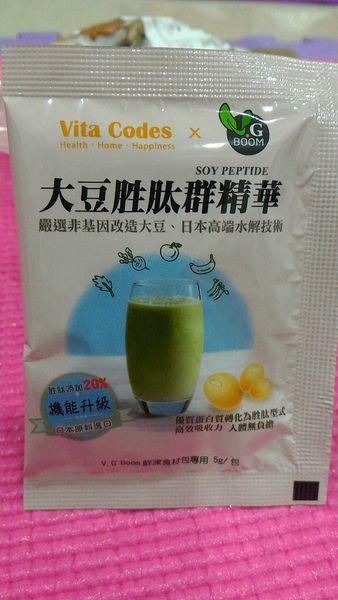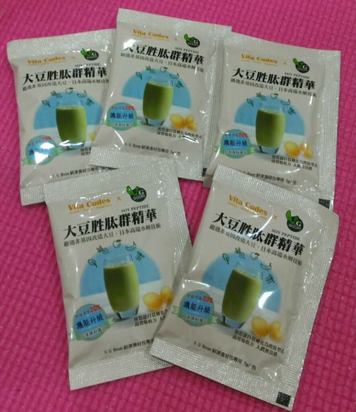還附上5包 大豆胜肽群精華, 打果汁時一起加入,