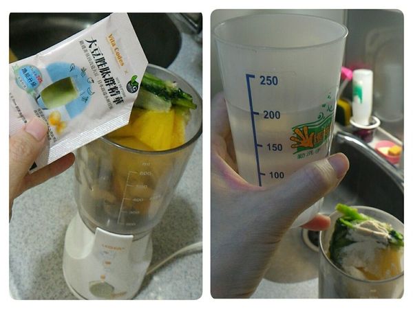 依序加入大豆胜肽群精華, 200cc溫熱水, 打兩分鐘