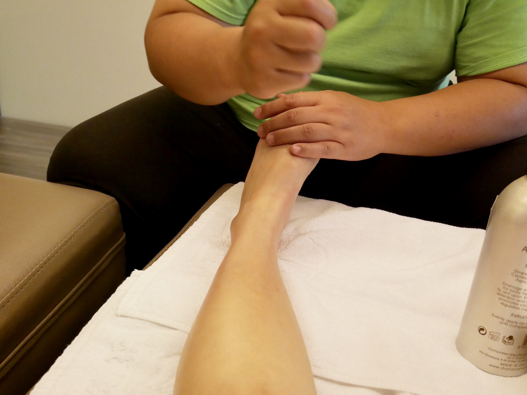 在按摩的時候 , 邊搭配精油 , 跟一般腳底按摩的乳液不太一樣 , 有些熱熱的 , 這好像就是在消水腫