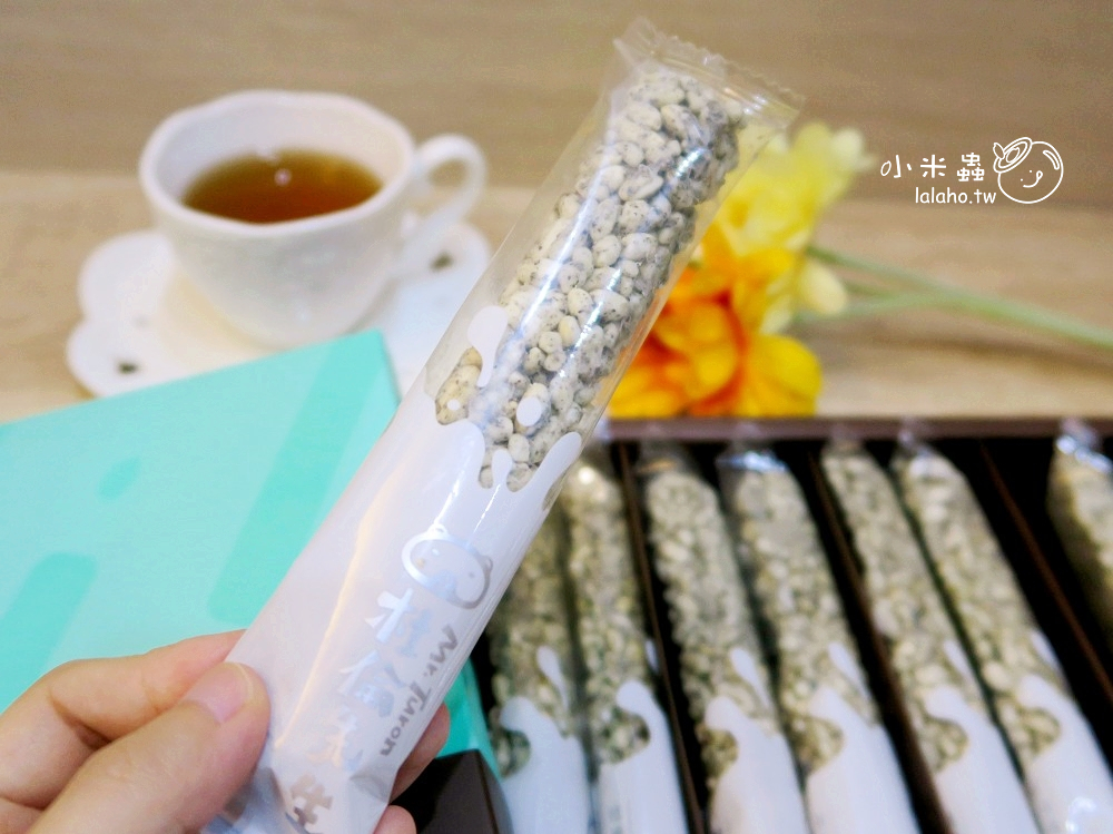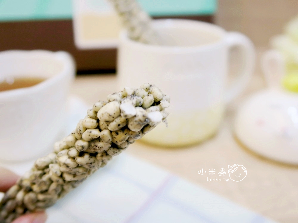 咬下一口,喀擦一聲,非常酥脆悅耳的聲響,可以嚐到特殊的米香、白巧克力的甜與芝麻的香,感覺不論是大人小孩都會喜歡,而且將它冷凍後,它還能當攪拌棒,攪拌牛奶或咖啡都有不同的滋味享受,米香、芝麻香、巧克力的甜融化在飲品中,WOW~味道非常的豐富且多層次喔!