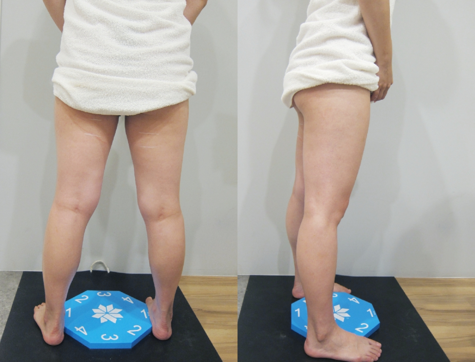 右邊是已經完成的樣子,可以看的出來大腿外側線條比較平滑,小腿也退了水腫,整體看起來修長許多!