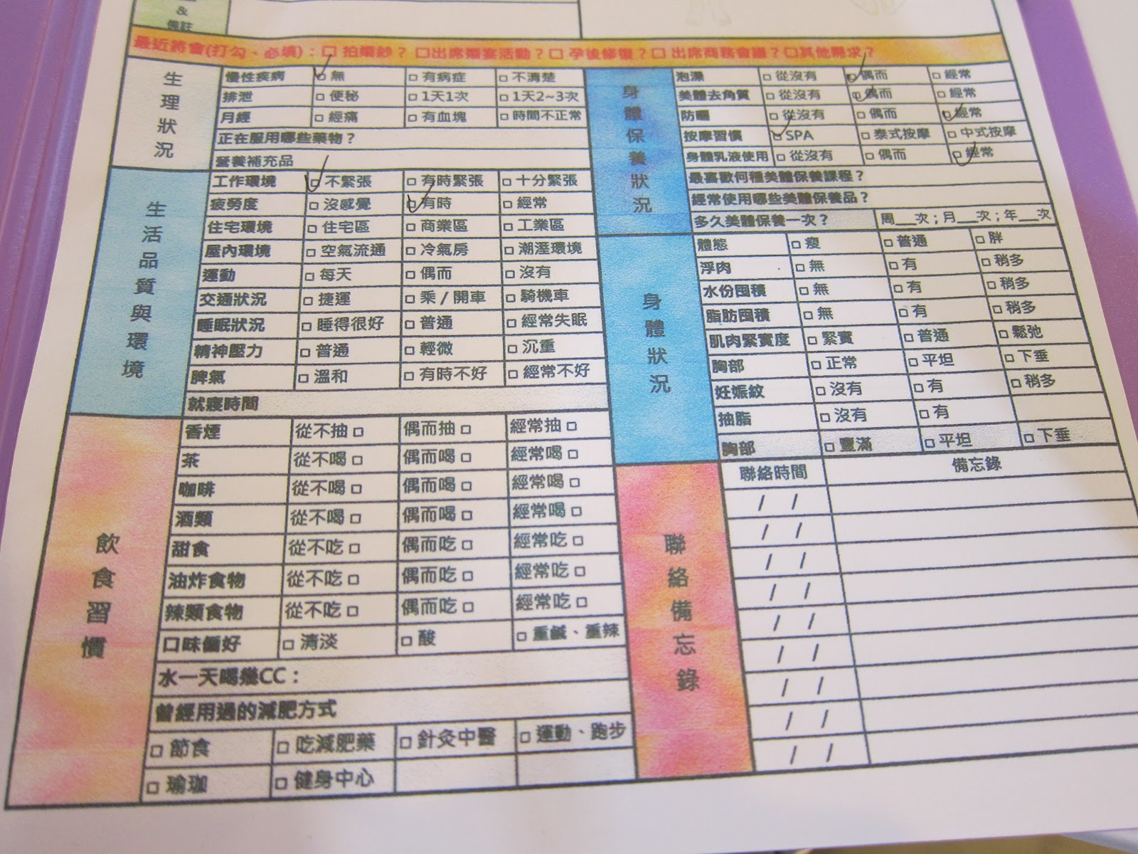 先填寫基本資料與生活作息方式,讓美體師能初步了解我們的需求。