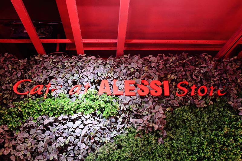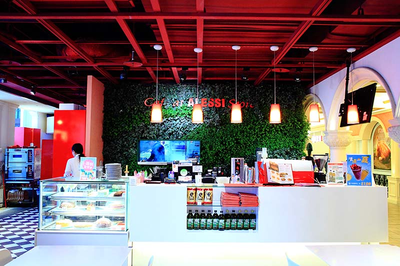 Cafe at ALESSI Store 板橋大遠百店 入口處,一入內特別用了開放式櫃檯,背面牆面大量運用綠色植生牆作為裝飾,紅色吊燈,非常有格調,上頭的品牌名顯得更顯眼。櫃子上擺放的麵條、橄欖油都是採用義大利原裝進口的,咖啡豆、咖啡機許多也是義大利品牌,吃的安心。