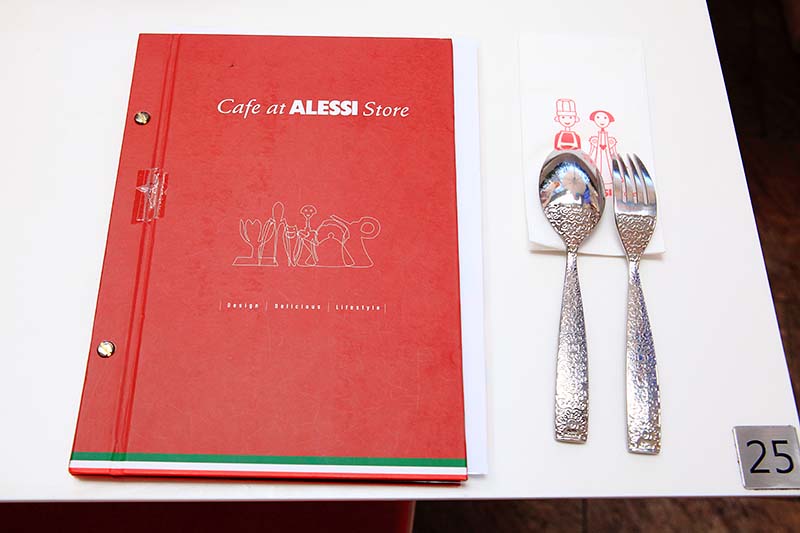每位來訪用餐的客人,一入座就可見店內提供的Cafe at ALESSI Store菜單、餐具擺設,右下角都會提供桌數,方便點餐,以便於服務人員服務。