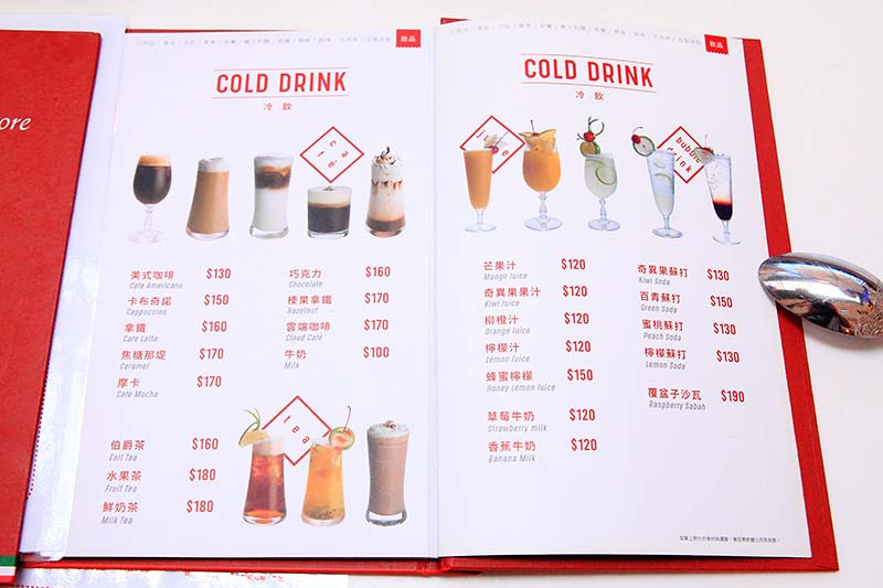 飲料的部分選擇也不少,冷、熱咖啡、水果茶、果汁、夏天的冰沙都提供,琳琅滿目,用心製作的菜單與料理,符合多種需求饕客,一次滿足。