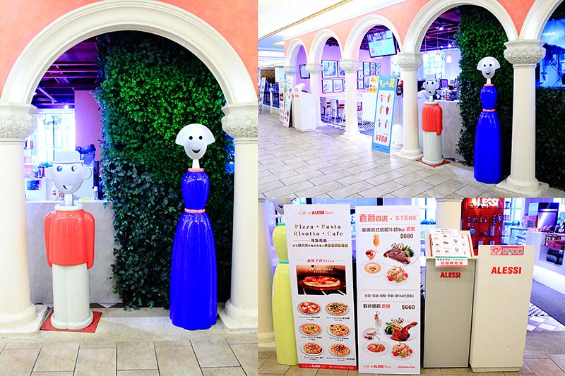 Cafe at ALESSI Store 板橋大遠百店 門口大量運用歐洲宮殿般外型的白色拱門,鮮紅色品牌視覺品牌色系,宛如義大利人性格,熱情奔放又帶浪漫氣息,店內店外放置一尊一對大型安娜G人偶娃娃(如上圖左),是有名的安娜G開瓶器的放大版,非常可愛。