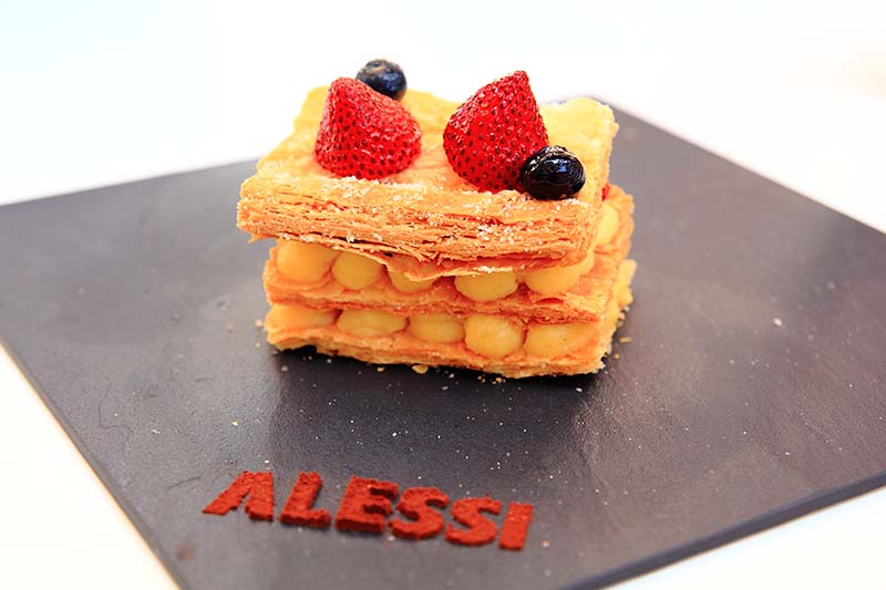 Cafe at ALESSI Store 板橋大遠百店,飯後甜點也不馬虎,格外用心,千層派一層層堆疊,旁邊還有個精緻可可粉製作Logo,很可愛,比較可惜是千層冰久了,千層不夠酥,餅皮比較不脆,軟軟的,上頭有新鮮水果草莓點綴,的確很有賣點。