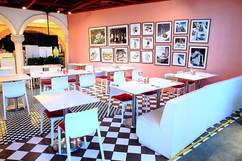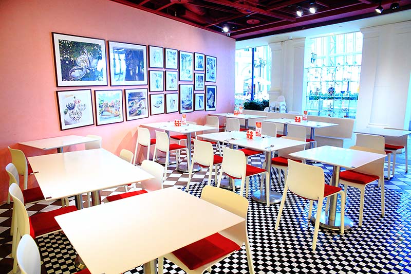 Cafe at ALESSI Store 板橋大遠百店 裝潢風格非常大膽,很混搭,除了基本的明亮簡約的紅、綠、白休憩空間,結合淡粉紅色系牆面、黑色格子地板,往外走則提供露天戶外平台用餐區,室內可容納20幾張座位區,蠻寬敞的。