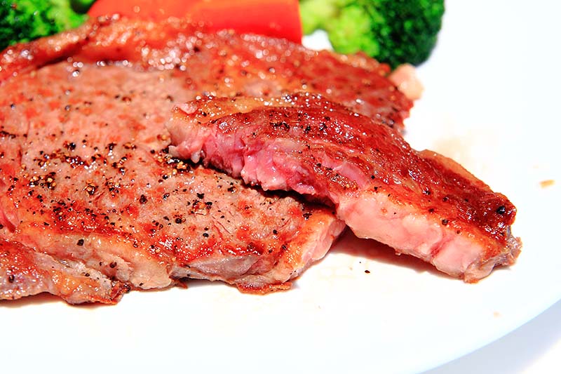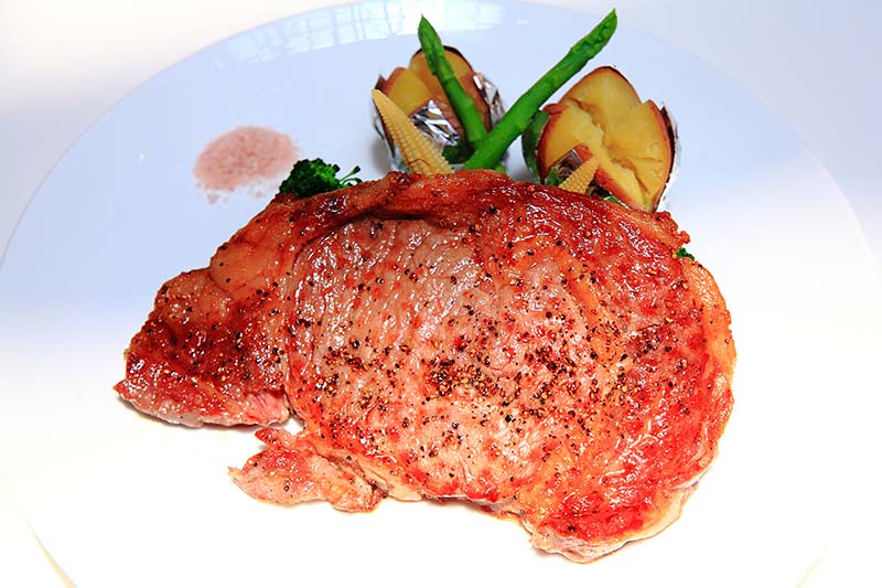 切下這厚切牛排,非常粉嫩,粉紅色系視覺感,上頭灑上黑胡椒,油脂充足,不噁膩,讓這款牛排香氣濃郁,加入海鹽可以搭配,淡淡鹹味能帶出牛肉鮮甜,愛吃牛排可點此套餐。